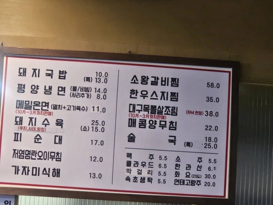 수육 순재 소갈비찜 평양냉면 가자미식해등이
