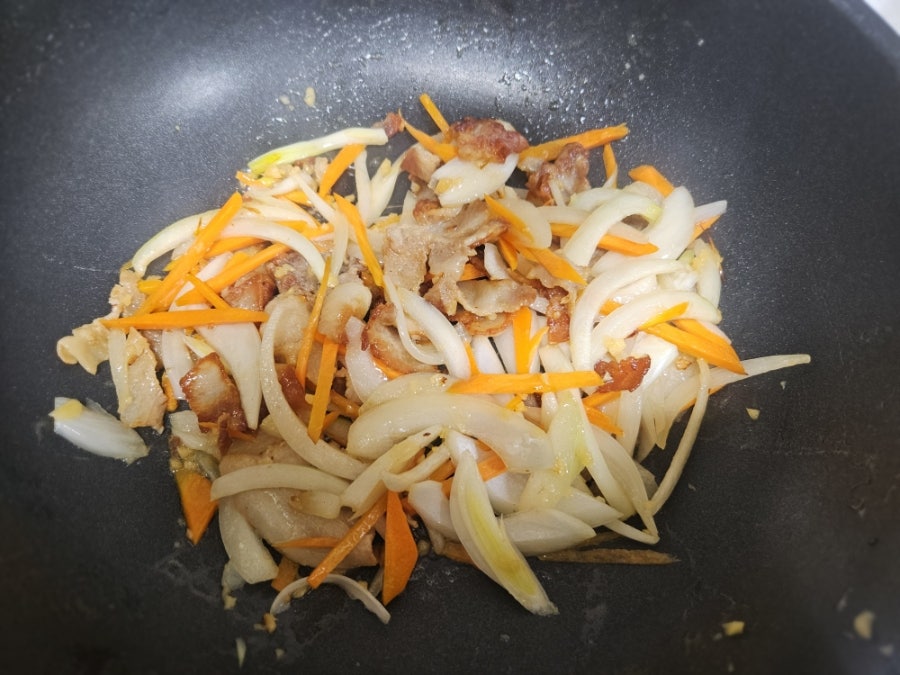 마늘향이 나기 시작하면 썰어놓은 양파와